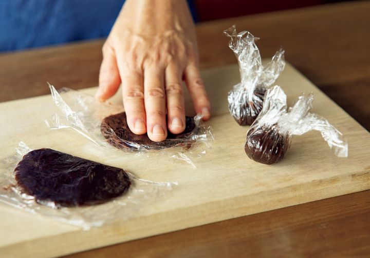 粒あんを4等分にし、15cm四方のラップでそれぞれ包み、ラップの上から厚さ2~3mm に手でのばす。