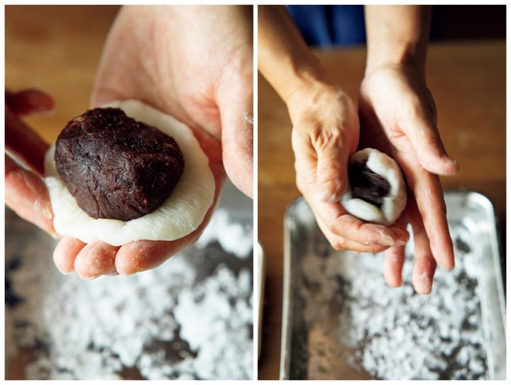 餅生地を手にのせ、厚さ5~7mmに丸く広げる。 1枚につき(1)を1個のせ、両手のひらを使って餅生地を下から上に少しずつ 引き上げるようにしながらあんを包み、口を閉じて丸く形を整える。バットに戻し、全体に片栗粉を薄くまぶす。