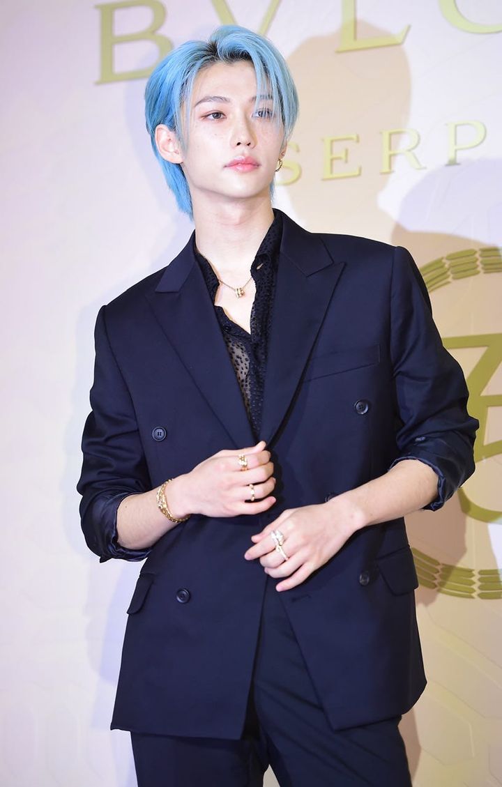ブルガリのセルペンティ75周年イベントでキャッチ。くすみのない肌にライトブルーのヘアカラーが映え、神秘的なオーラを醸し出す。