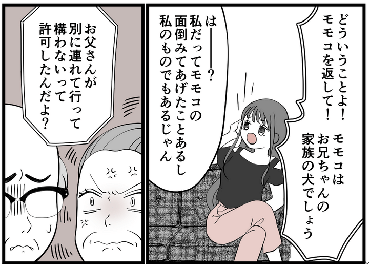 義母は「そもそもモモコはお兄ちゃんの家族の犬だ」と伝えましたが、サナちゃんは「お父さんがいいと言ったし、自分もモモコの面倒をみていた」と反論しました。