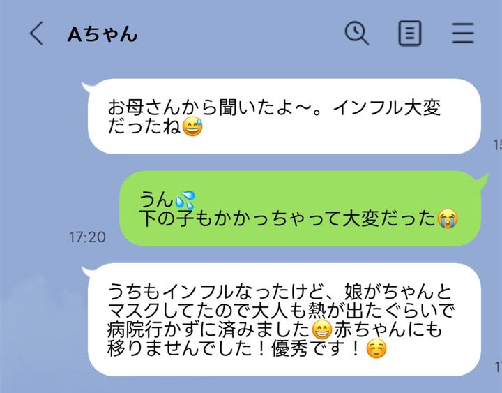 こっちは赤ちゃん含めてインフルでダウンして病院行きまくって大変だったのに、「うちもインフルなりましたけど娘がちゃんとマスクしてたので大人も熱が出たくらいで病院行かなくて済みました!!赤ちゃん移りませんでした!優秀です!」って義妹からLINE来るの意味がわからん😇