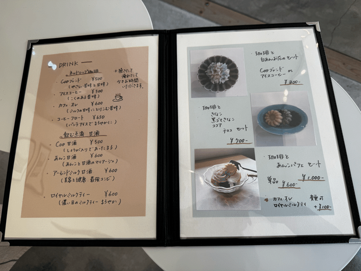 珈琲の看板にひかれて店内に入ったのですが、メニューを見て悩んじゃいました。ネルドリップ珈琲と、飲む点滴 甘酒。コーヒーを買いに行ったのに甘酒。あまり時間がなかったのでCooブレンドをテイクアウトで注文しました。次に時間のある時は、きれいなお菓子と一緒にいただきたいです。パフェもある!珈琲と和菓子。大人な組み合わせですね。