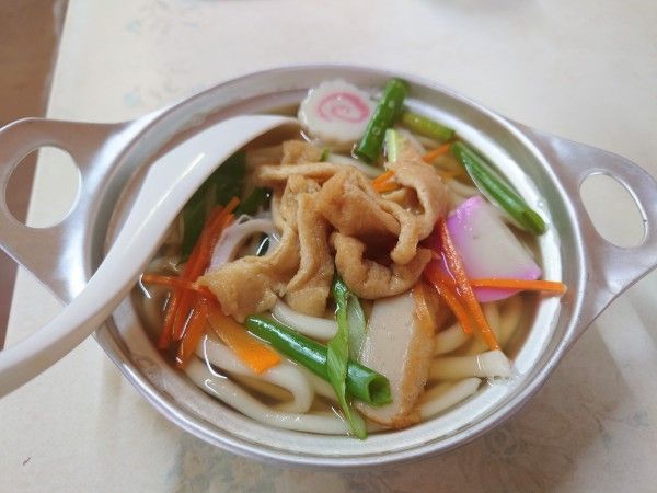 ●鍋焼うどん500円 一口食べさせてもらったらこちらも美味しい!!スープが甘くておうどんは柔らかくほっとする大好きな味!!アルミ鍋といえば愛媛のご当地グルメとしても人気の「鍋焼うどん」がパット思い浮かびます。愛媛の味!次は鍋焼うどんを頼むと誓いました!