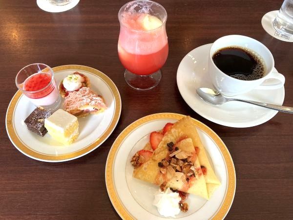 「苺のスイーツブッフェ」から、ストロベリーミルクプリン、ピスタチオとストロベリーのタルト、ストロベリーとチョコレートのモンブランシュー、ストロベリーショートケーキ、ガトーショコラ。どれもイチゴと相性ぴったりで美味しく、ショートケーキのスポンジはとってもきめが細かくシルキー!