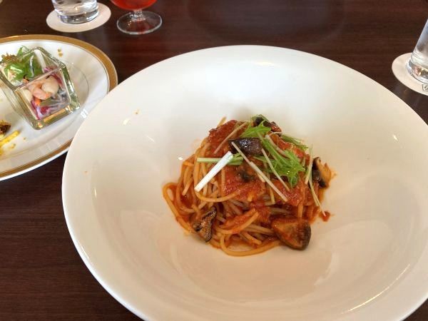 選べるメインディッシュはベーコンとキノコのトマトソーススパゲッティにしました。