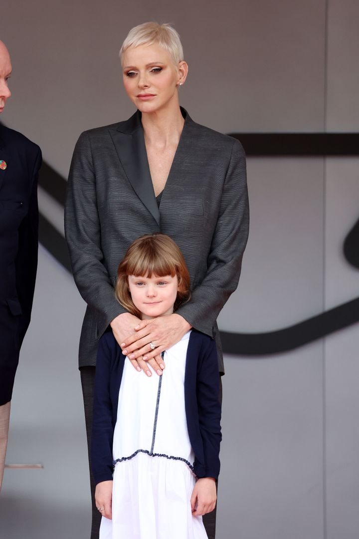 2022年4月、フォーミュラEのモナコグランプリにファミリーで出席。療養生活を経て、15ヶ月ぶりに公の場へのカムバックとなったシャルレーヌ公妃。妃の表情はまだまだ硬いけれど、ママからそっと手を回されたガブリエラ公女はうれしそうでほっこり。