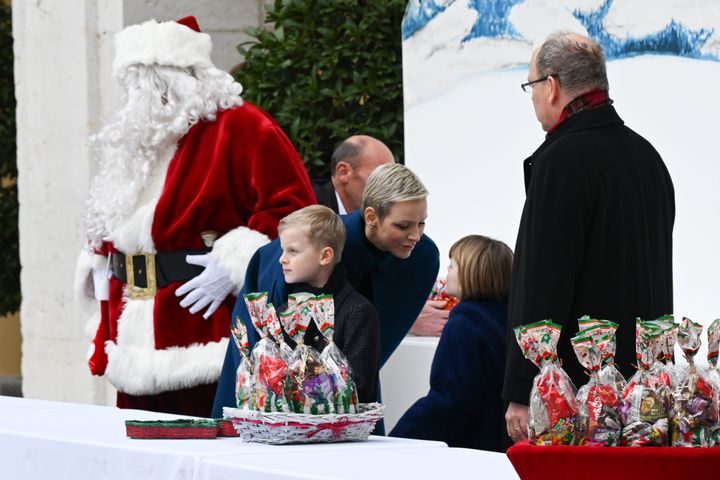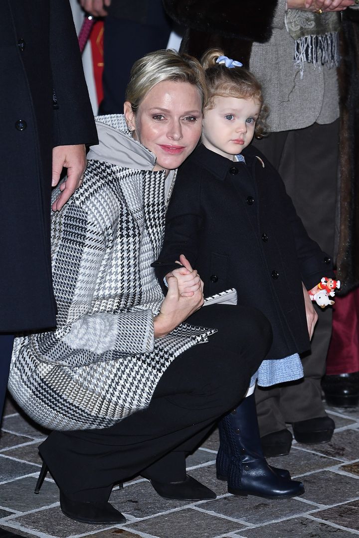 2022年12月、モナコ宮殿でのクリスマスイベントに姿を見せたファミリー。王女に目線を合わせ、何かを語りかけているであろうシャルレーヌ公妃の表情がとっても優しげ。