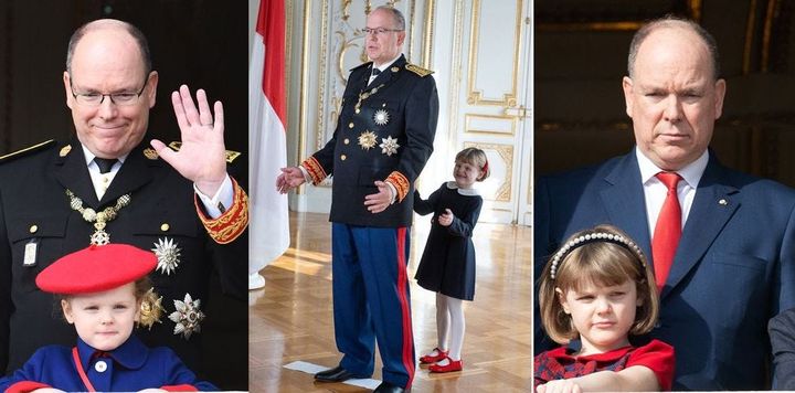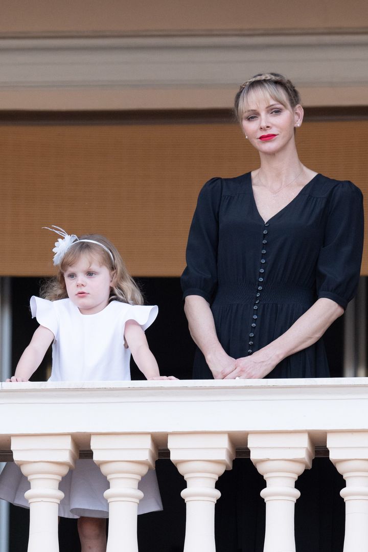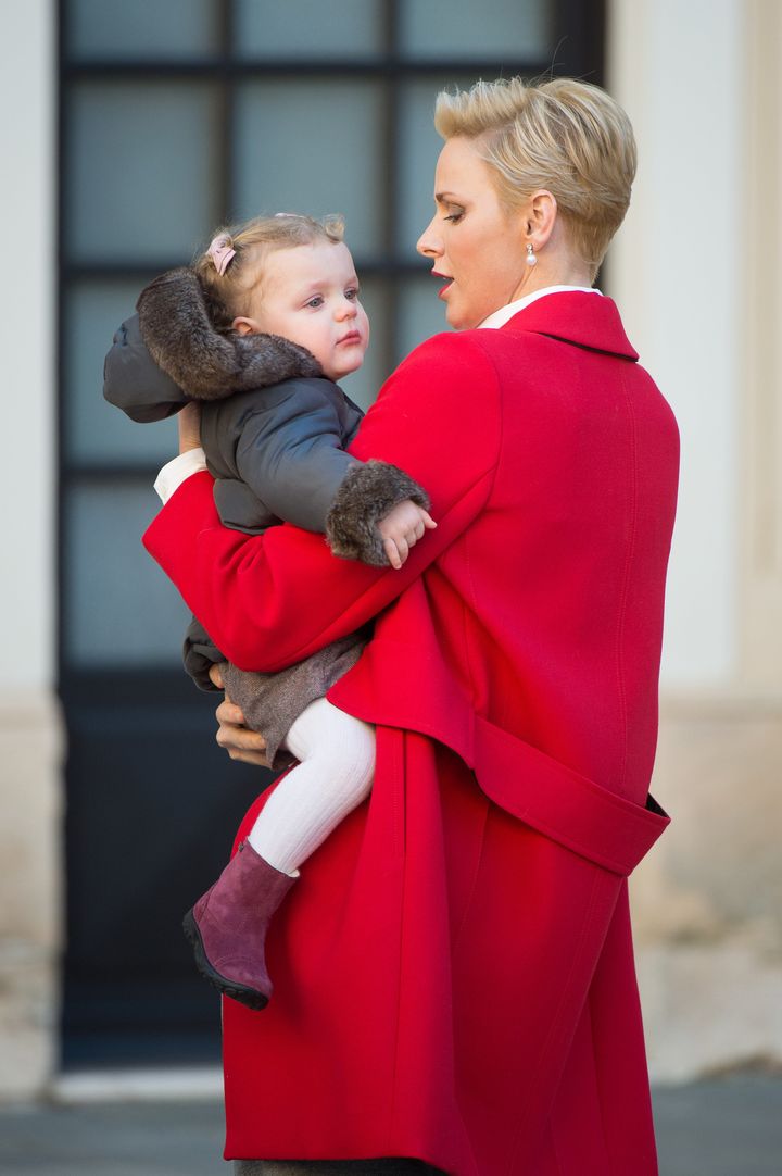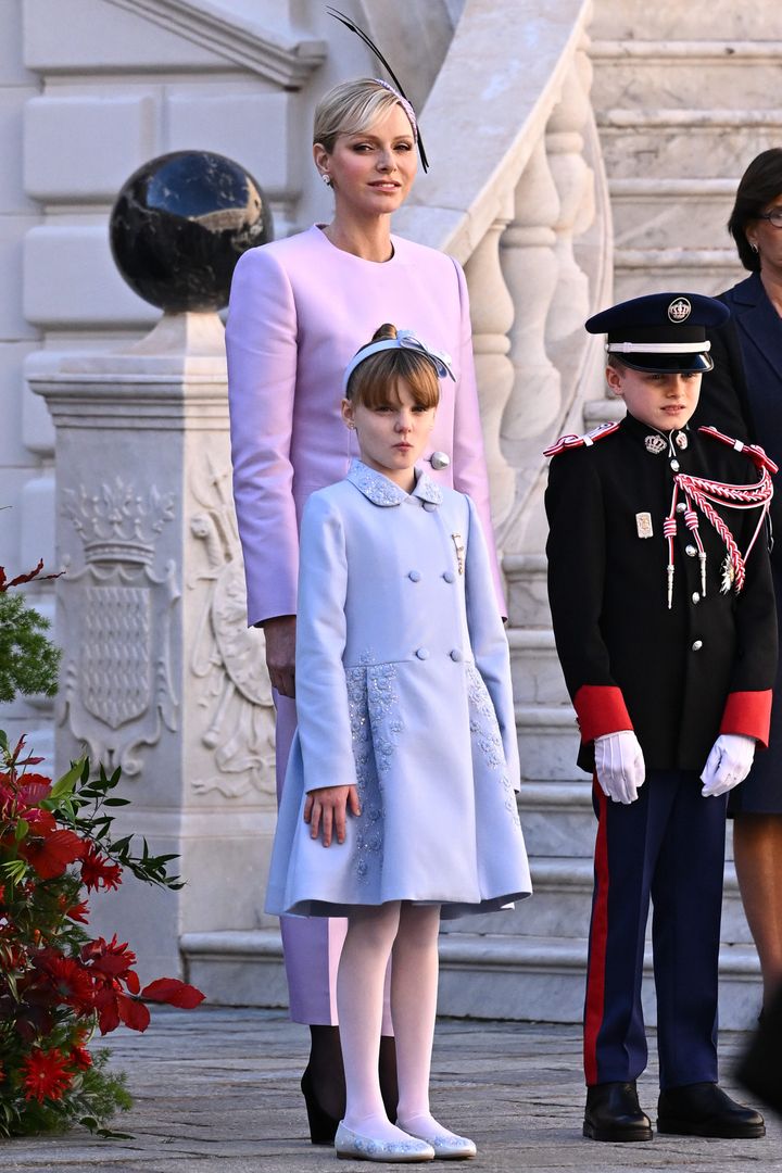2022年11月、モナコのナショナル・デーでは、純白のコートをまとった公妃と、真っ赤なダブルブレストコートを着た公女をバルコニーで発見。国旗カラーのリンクコーデがパーフェクト!