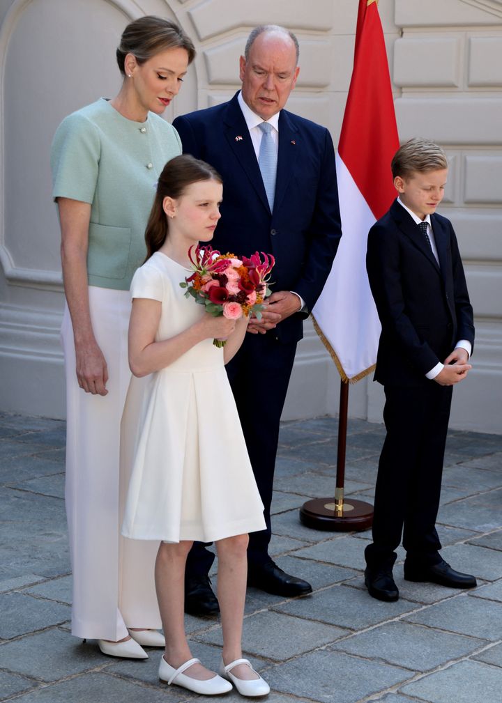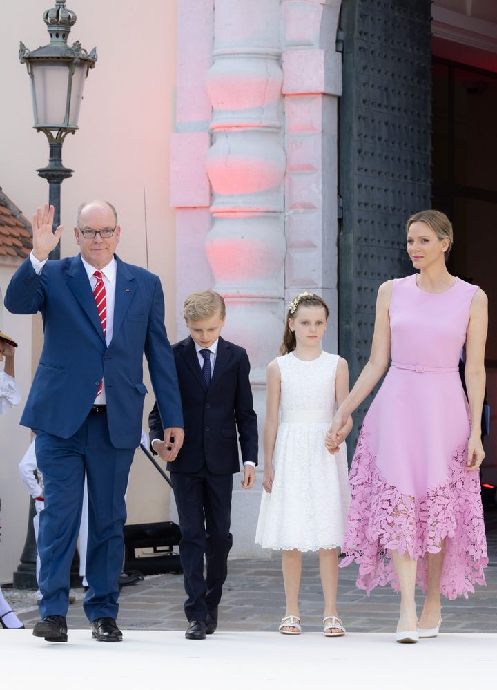 モナコの建国記念日式典に出席。シャルレーヌ公妃は赤、ガブリエラ公女はブルーの対照的なワンカラーコーデで登場。ガブリエラ公女の足元はクリスチャン ルブタンのメリージェーン! 9歳にして既にハイブランドを着こなしています。