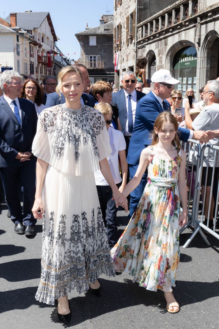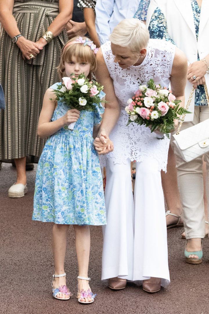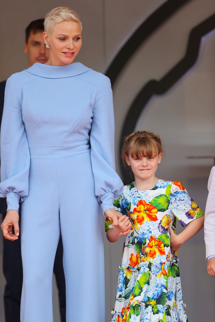 2022年5月、F1モナコグランプリでは、南アフリカのデザイナー、テレンス・ブレイのライトブルーのオールインワンを着用したシャルレーヌ公妃。南国ムードなフローラルドレスをまとったガブリエラ公女とのコーデも相変わらず息ぴったり! さりげなく手をつなぎ、うれしそうな公女の表情もキュート。