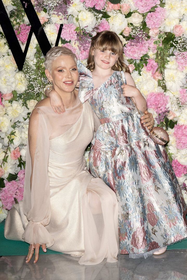 2022年5月、第10回モンテカルロ・ファッション・ウィーク中に開催されたファッションアワードに出席。シャンパンカラーのドレスに身を包んだシャルレーヌ公妃と光沢のある織ドレス姿の公女を捉えた母娘ショットは、まるで絵画のような神々しさ。