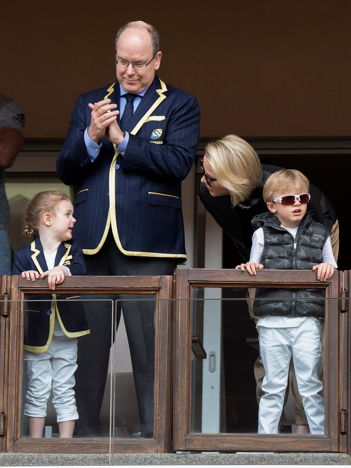 2023年4月、聖デヴォート・ラグビートーナメント大会にファミリーで出席。ガブリエラ公女、そして双子の弟、ジャック公子の肩に手を置いたシャルレーヌ公妃の顔には穏やかな笑みが。ネイビー×白の母娘コーデも決まっています。
