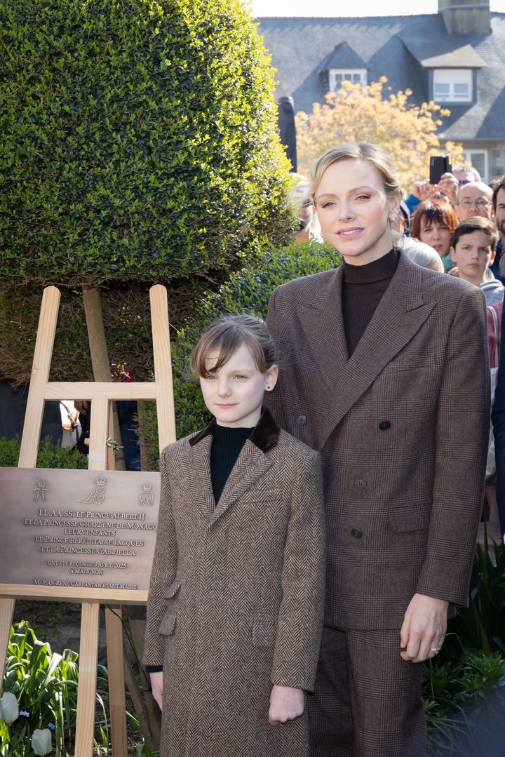 2025年4月9日、フランス・マティニョン訪問時のシャルレーヌ公妃とガブリエラ公女のファッションは、ラルフ ローレンで揃えた洗練されたリンクコーデ。