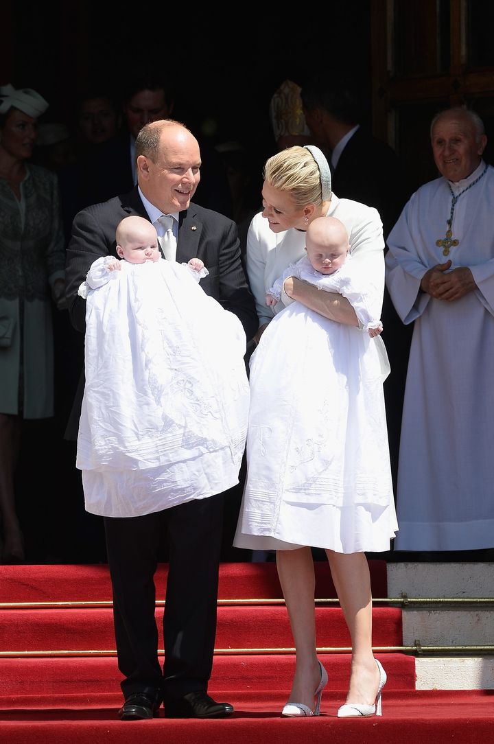 2015年5月、双子の洗礼式では、純白ドレスに身を包んだシャルレーヌ公妃。ジャック公子を抱っこしながら、ガブリエラ公女に微笑みかける姿に幸せがはじけて。