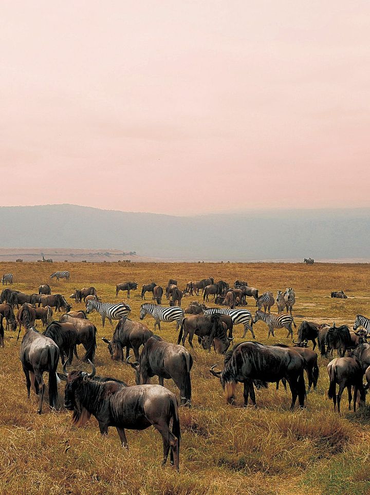 ヌーとシマウマの群れ。ピンクの空とアースカラーに、モノクロのコントラスト。 Ayumi Kusumi
