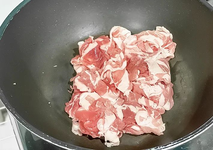 火をつける前のフライパンに、豚肉をパックからすべて出します。