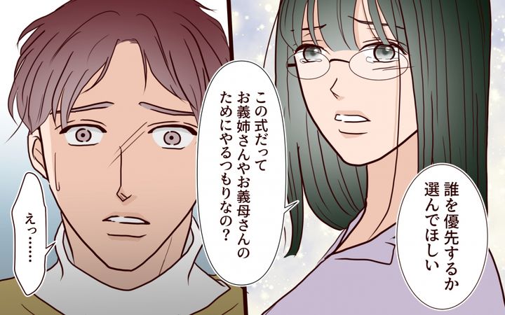 瀬奈から「誰を優先するか選んでほしい」と言われてハッとしました。僕は姉と揉めるのが面倒だったし、母も悲しませたくなかった…。でも結婚式ー…というか僕たちの結婚は、僕が瀬奈と家庭を築いていく決意を祝ってもらうもの。姉の顔色をうかがっている場合じゃありませんでした。