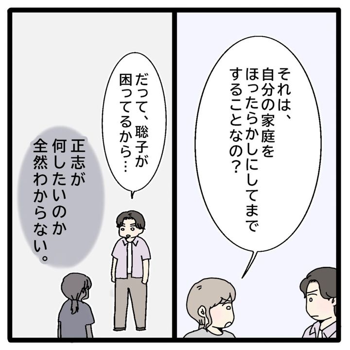 聡子さんとデートするわけでもなく、ただ聡子さんとその息子の航くん、そして多田家のために動いていたと言う正志。私はどうしても納得がいかず「それは、自分の家庭をほったらかしにしてまですることなの?」と問いかけました。すると「だって聡子が困ってるから・・・」と子どものような言い訳をぽつり。私は、正志が何をしたいのか全く理解できませんでした。