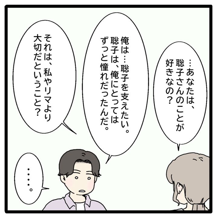 「・・・あなたは聡子さんのことが好きなの?」恐る恐る尋ねると、正志は「俺は聡子を支えたい、俺にとって聡子はずっと憧れの存在だったんだ」と曇りのない目で答えました。私は、胸の痛みに気づかないふりをして「それは、私やリマより大切だということ?」と静かに問いかけます。しかし、正志は何も答えてくれませんでした。