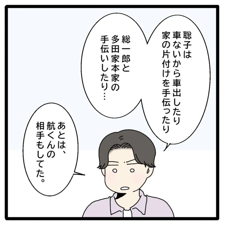 すると正志は、多田家で何をしていたかを、ひとつひとつ話し始めました。「聡子のために車を出したり、家の片づけを手伝ったり、総一郎と本家の手伝いをしたり・・・あとは、航くんの相手もしてた」