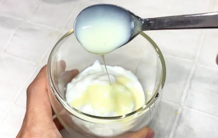 作り方の工程は、驚くほどシンプル。 まず、グラスにヨーグルトを入れ、そこに練乳を加えましょう。