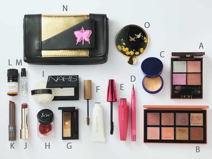 A.アイカラーレーション12/ルナソル B.ホリデーコレクション パレット 2024/THREE C.コンシーラ/リサージ ボーテD.密着アイライナー ブラックブラウン/dejavu E.塗るつけまつげ ブラック/dejavu F. アイブロウマスカラブロウカラ03 /rom &nd G. デザイニングアイブロウ3D EX-4/ ケイト H.クリームチーク ラディーレッド/&be I. パウダーブレストN02415 /NARS J. リップカラー10&リップカラーケースWS/ RMK K. フラッシュティントリップ(ブラウン)/ロート L. アロマオイル 精油03 /ARTQ ORGANICS M.香水 Dark Amber&Ginger /Jo malone N.ジョジョのポーチ O.七宝焼の鏡