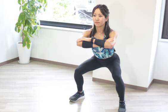 1.お尻を後ろに引くようにして、太ももが床と平行になるくらいまでゆっくりとしゃがむ(3秒)