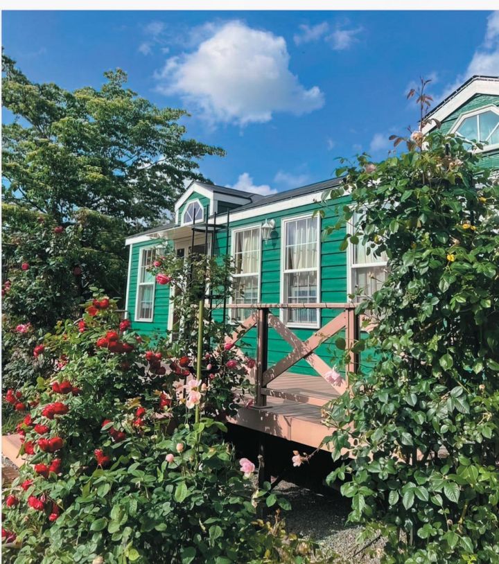 御殿場の家は、「スタジオKキルトミュージアム」として公開。キャシーさんの代表作など、貴重な作品が多数展示されている。敷地内にある緑色の建物は、実はトレーラーハウス。パッチワークキルトのキットや生地を販売している。