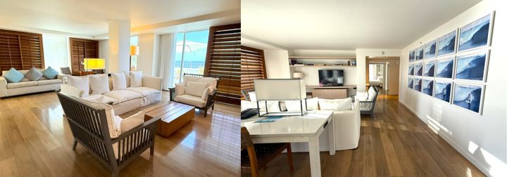リビングルームにはゆったりとしたソファが複数配置され、開放感あふれる空間。
