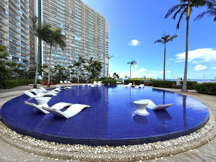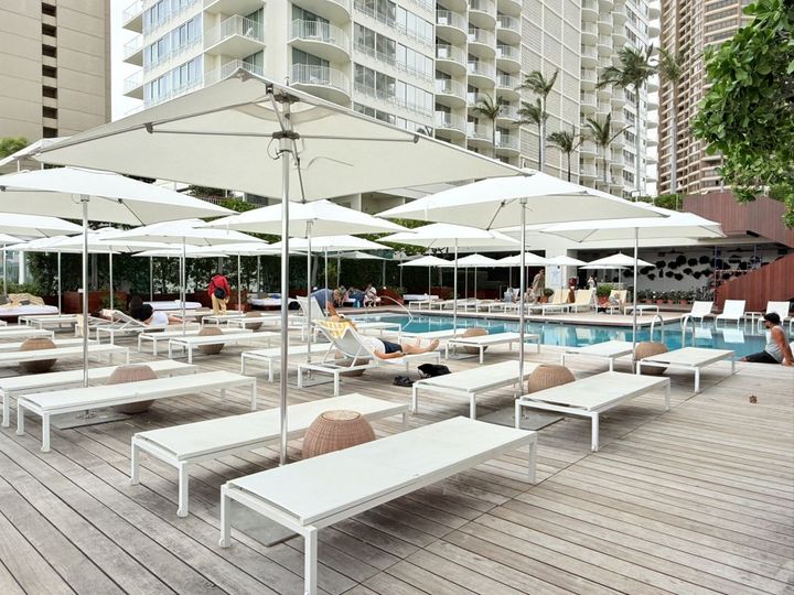 ワイキキにありながら、プールエリアにはハワイらしいヤシの木や豊かな植栽が施され、都会の喧騒を忘れさせるリゾート感あふれる空間が演出されています。