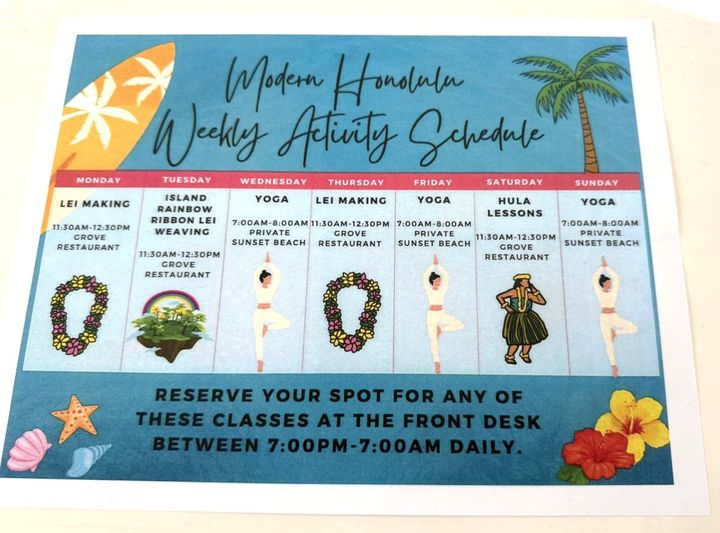 カルチャーアクティビティは、月・木曜のレイメイキング、火曜のリボンレイ作り、土曜のフラレッスンに加え、水・金・土曜の朝7時から行われるヨガなど多彩。滞在中は毎日何かしらの体験を楽しめます。