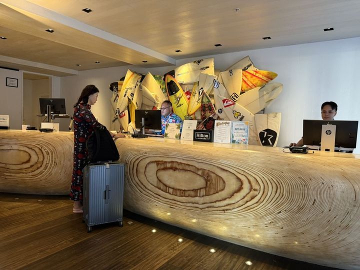 チェックイン時にまず目に飛び込んでくるのが、フロントデスク背後の壁に飾られたサーフボードのオブジェです。鮮やかなネオンイエローをはじめ、さまざまな色合いの折れたサーフボードがコラージュされ、中には実際に使用したプロサーファーのサイン入りボードもあり、印象的な空間です。