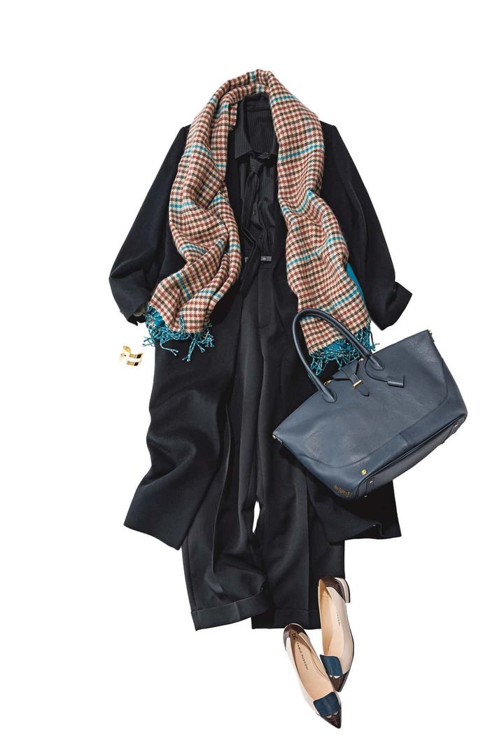 コンサバティブな黒コートは、映えるストールを足すだけで印象チェンジ!オールブラックのきちんとコーデに、真面目すぎない今っぽさが入り、パッと垢抜けます。