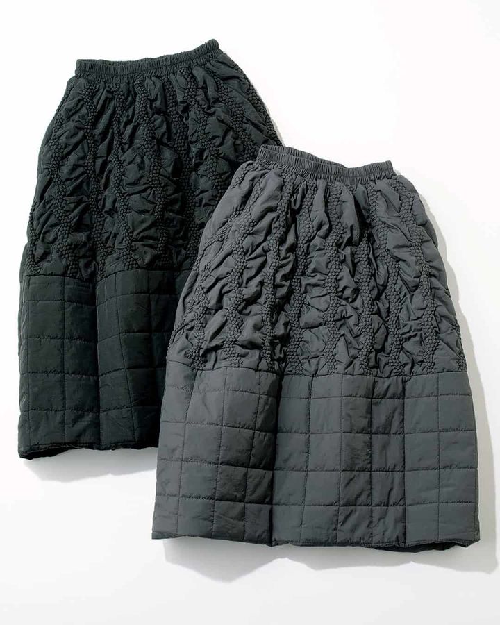 動くたびに揺れるドラマティックなボリュームスカートは、細やかに加工が施されたキルティングが高見えして大人にぴったり。華やかなデザインなので、モノトーンを選ぶのが正解。ウエストはオールゴムのストレスフリー設計、自宅で洗えるイージーケアなのも嬉しい。