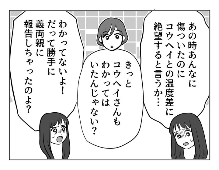 マユさんは妊娠報告に慎重になっているこの気持ちを、コウヘイさんと共有できていると思っていたのでしょう。だから裏切られたような気になってしまった……まぁ……わからなくはありません。ただ、それだったら自分も実両親に報告するときにコウヘイさんに相談はしたのでしょうか。マユさんが流産したときに、コウヘイさんがどれだけ悲しかったかを想像したことはあったのでしょうか。