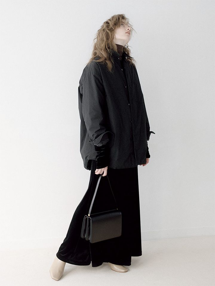 ダウンにありがちなアウトドア感や膨張感がほとんどない、クールな黒シャツのようなダウンシャツ。表地に用いたドライタッチのタイプライタークロスが、スポーティな印象をそいでドレッシーな服とも違和感なく着られる面持ちへ。両サイドのポケットもシームに沿って目立たず配し、細部まで抜かりなくシンプル。