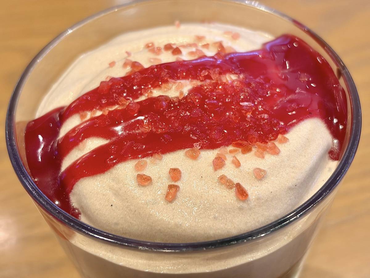 グラスの底にたっぷり入った甘酸っぱいストロベリー果肉と、チョコレートソースを使ったショコラムースのほろ苦い味わいが絶妙にマッチしています!
