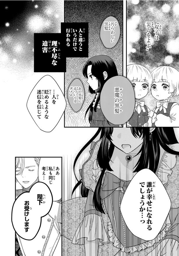 悪人に多い黒髪に生まれたことで、“悪魔”と呼ばれ迫害されてきたジュリア。それゆえ膨大な魔力の持主であることを隠して暮らしていたが、ある日突然、国王の再婚相手に選ばれる。しかも、いきなり双子王子の継母になることに…!? 断るつもりが、天使のように愛らしい王子たちにメロメロ! ところが、「不吉な双子」という迷信と、魔力がないせいで双子王子たちの行く末は超絶前途多難だった…。不当な差別を受けるふたりに、自らの境遇が重なってみえたジュリアは、継母として彼らを守り育てる覚悟を決め!? 嫌われ悪女×天使な双子王子の家族愛溢れる子育てファンタジー『双子王子の継母になりまして~嫌われ悪女ですが、そんなことより義息子たちが可愛すぎて困ります~』をお楽しみください。