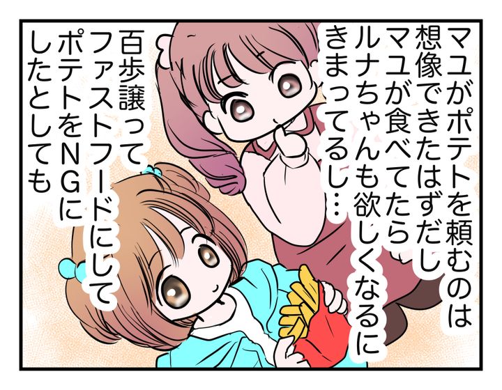 ミチルさんは30代の専業主婦、ひとり娘のマユちゃんは幼稚園の年中さんです。ある土曜、ミチルさんは仲良しのルナちゃん親子とピクニックへ行くことに。しかしお昼に用意したファストフードがきっかけでひと騒動が。母親シオンさんにフライドポテトを制限されていたルナちゃんが、マユちゃんのフライドポテトを食べ尽くしてしまったのです。その後楽しくは遊べたのですが、ミチルさんはかなりお疲れ。シオンさんのルナちゃんへの食事制限にも疑問をもちます。