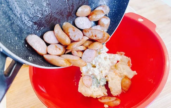 2.焼いたウインナーをポテトサラダに入れる