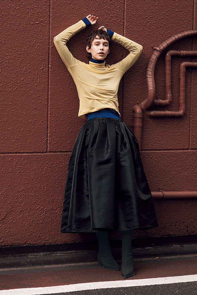 イエロータートルネックニット/ヴィルーム(ギャルリー・ヴィー 丸の内店) 中に着たブルータートルネックニット/ジョン スメドレー(ビームス ハウス 丸の内) 黒フレアスカート/HER.