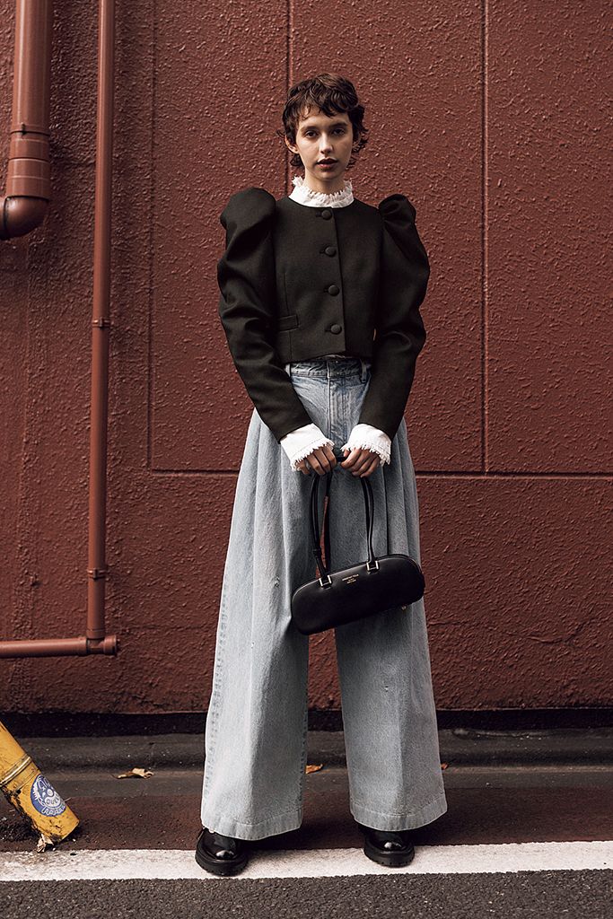 構築的なジャケットとフリルブラウス。映える服を組み合わせてドレスアップするときは、黒と白で冷静に。コンパクトな形でさらに迫力をセーブ。