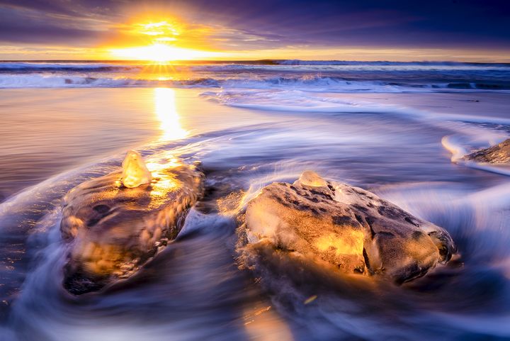 水平線から昇る光が氷に入った瞬間、オレンジ色や金色に染まり、それまで眠っていた氷が息を吹き返し、その内部から、あたかも自ら発光するかのような、幻想的な光景です。