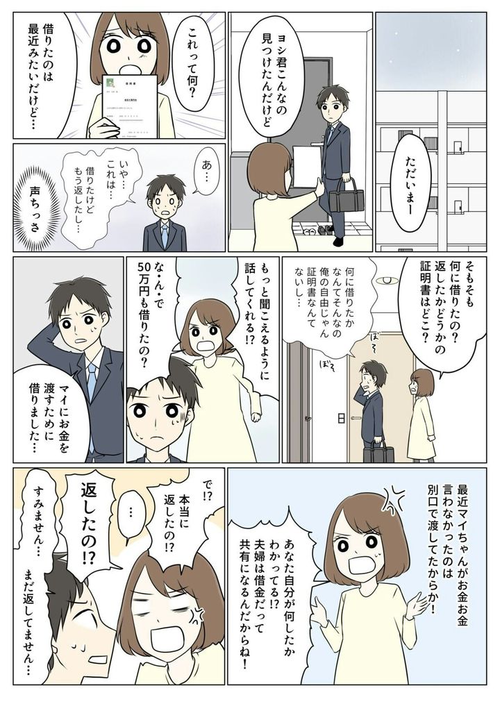 アイコがお金を貸すことに苦言を呈し、ヨシの小遣いから貸すように言うと一時はお金を貸す相談がおさまったものの、ある日ヨシ名義の50万円の借用書を発見。ヨシはアイコに黙って、マイに貸すお金を借金していたのです。