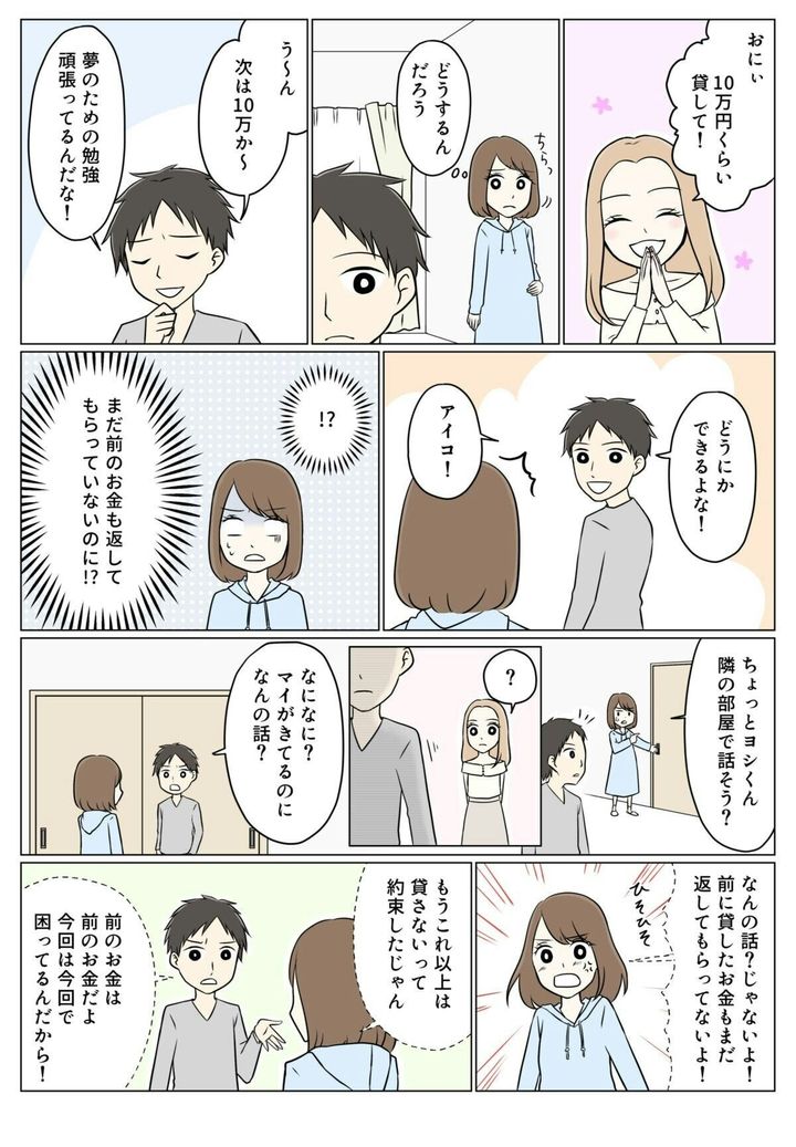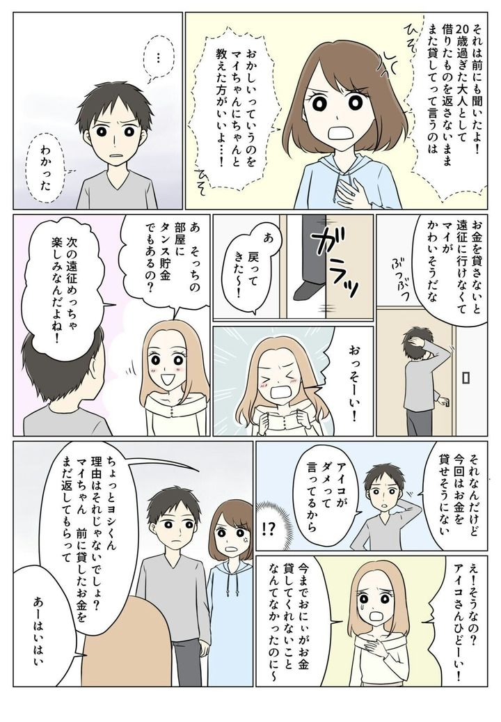 夫・ヨシが妹・マイに対してお金を貸してしまうことに対して困っている主人公・アイコ。マイがお金を借りたい理由も「夢のための勉強」というふんわりしたもので、推しのライブに行くなど遊んでいるようにしか見えず不信感がつのっていきます。