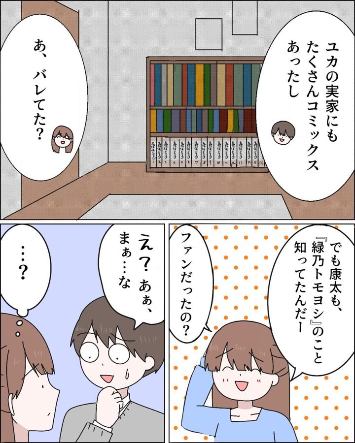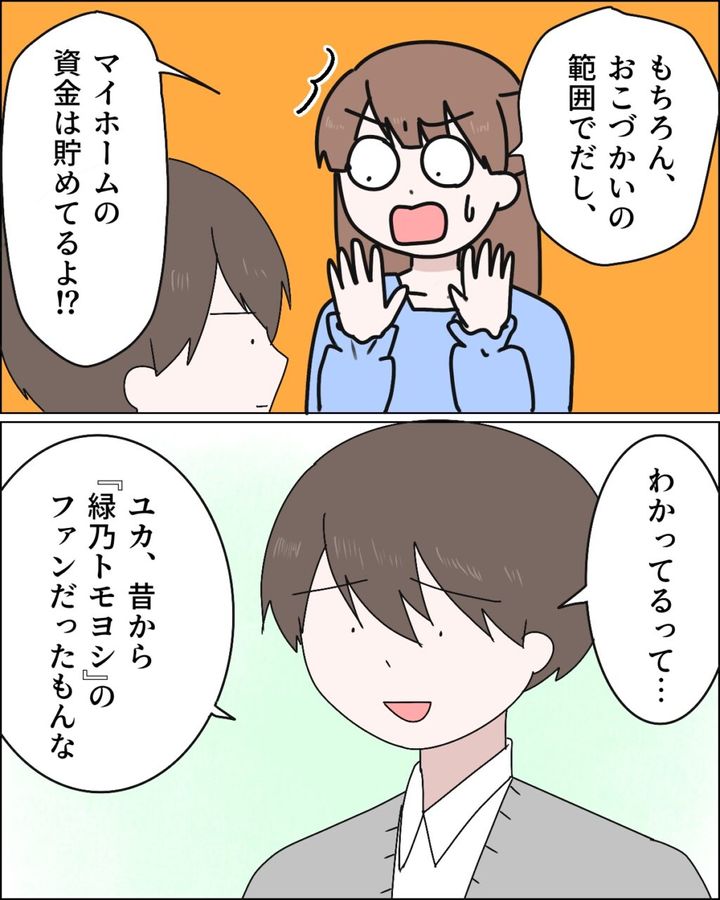 康太の表情を見た私は、慌てて「もちろんおこづかいの範囲でだし、マイホームの資金は貯めてるよ!?」と弁解しました。その必死さがおかしかったのか、康太はふっと表情を緩め、「わかってるって、ユカは昔から『緑乃トモヨシ』のファンだったもんな」と言いました。