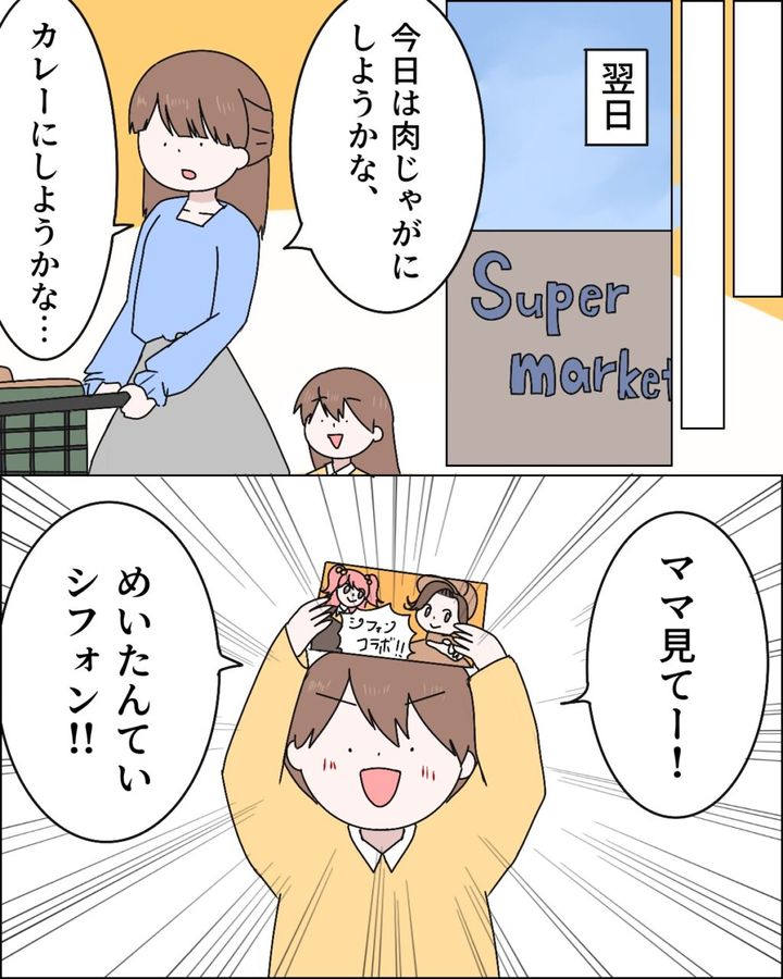 翌日、夕飯の買い出しのため、スーパーにやってきた私とマナ。肉じゃがにするか、それともカレーにするか・・・献立に悩んでいると、「ママ見てー! めいたんていシフォン!」とマナが嬉しそうに声を上げます。マナの手には、名探偵シフォンとコラボしたお菓子が握られていました。