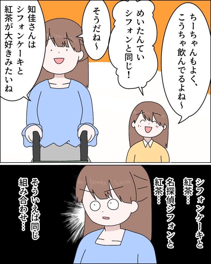 「ちーちゃんもよくこうちゃ飲んでるよね~、めいたんていシフォンと同じ!」そう無邪気に話すマナに、私は「そうだね~知佳さんはシフォンケーキと紅茶が大好きみたいね」と返しました。その瞬間、名探偵シフォンと知佳さんに共通点があることに、ふと気が付きました。そういえば同じ組み合わせだけど・・・さすがに考えすぎだよね。