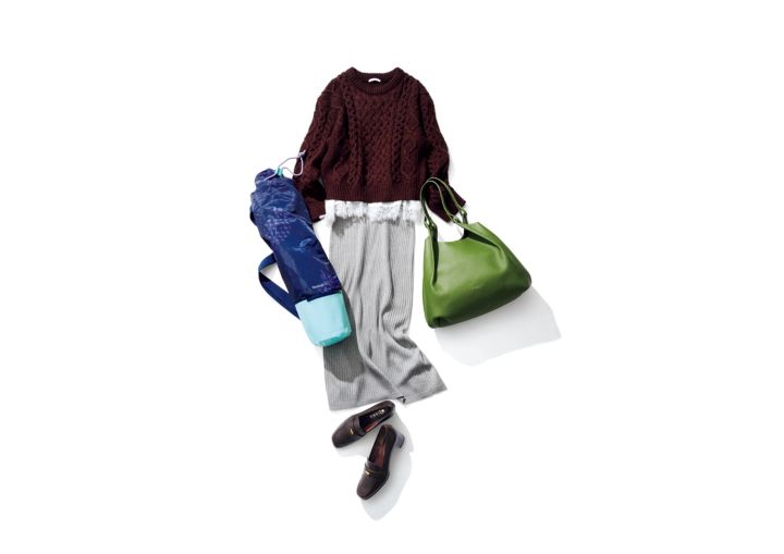 スカート¥26,400/スリードッツ(スリードッツ表参道店) レースキャミソール付きチュニック(キャミソール)¥23,100/アプワイザー・リッシェ ケーブルニット¥2,990/GU トートバッグ¥75,900/ジャンニ キアリーニ(ジャンニ キアリーニ 銀座店) コインローファー¥18,150/ダイアナ(ダイアナ 銀座本店)ヨガマット/編集部私物