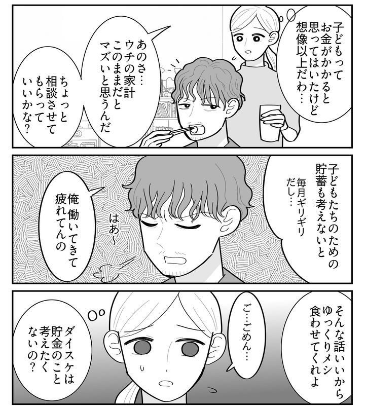 シュリが生まれて、すぐにリセを妊娠して……。子どもを育てるにはお金がかかると聞いていたけれど、想像以上の出費でした。貯金なんて全然できないので焦ります。ただダイスケは「先のことなんて考えたくもない」といった雰囲気です。